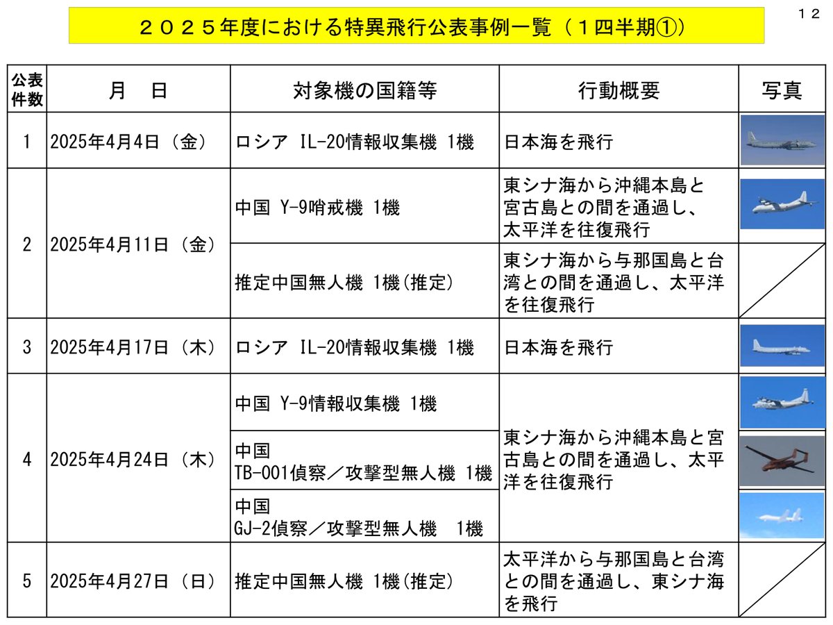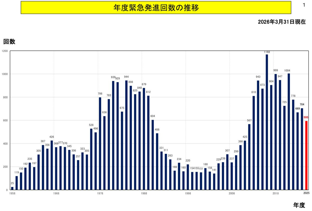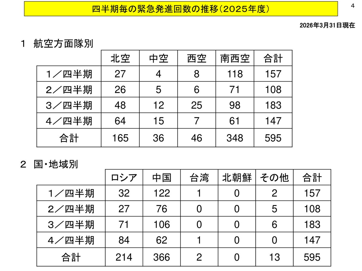 2025年度の緊急発進回数は595回。5月に中国海警船を発艦したヘリコプターによる領空侵犯、12月に中国空母を発艦したJ-15戦闘機による空自F-15戦闘機へのレーダー照射、中ロ爆撃機の太平洋共同飛行などの特徴的な事案が発生した年度となった。
