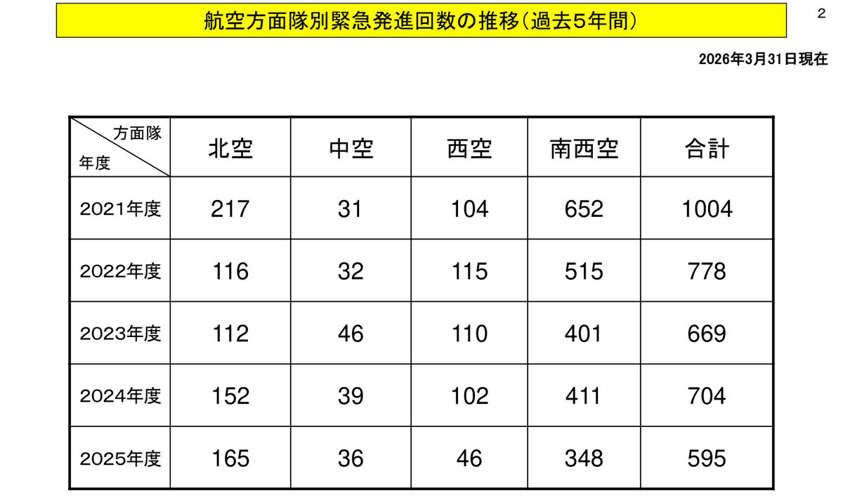 令和7年度の緊急発進実施状況を総括 発進回数595回、領空侵犯1回(4月17日)
