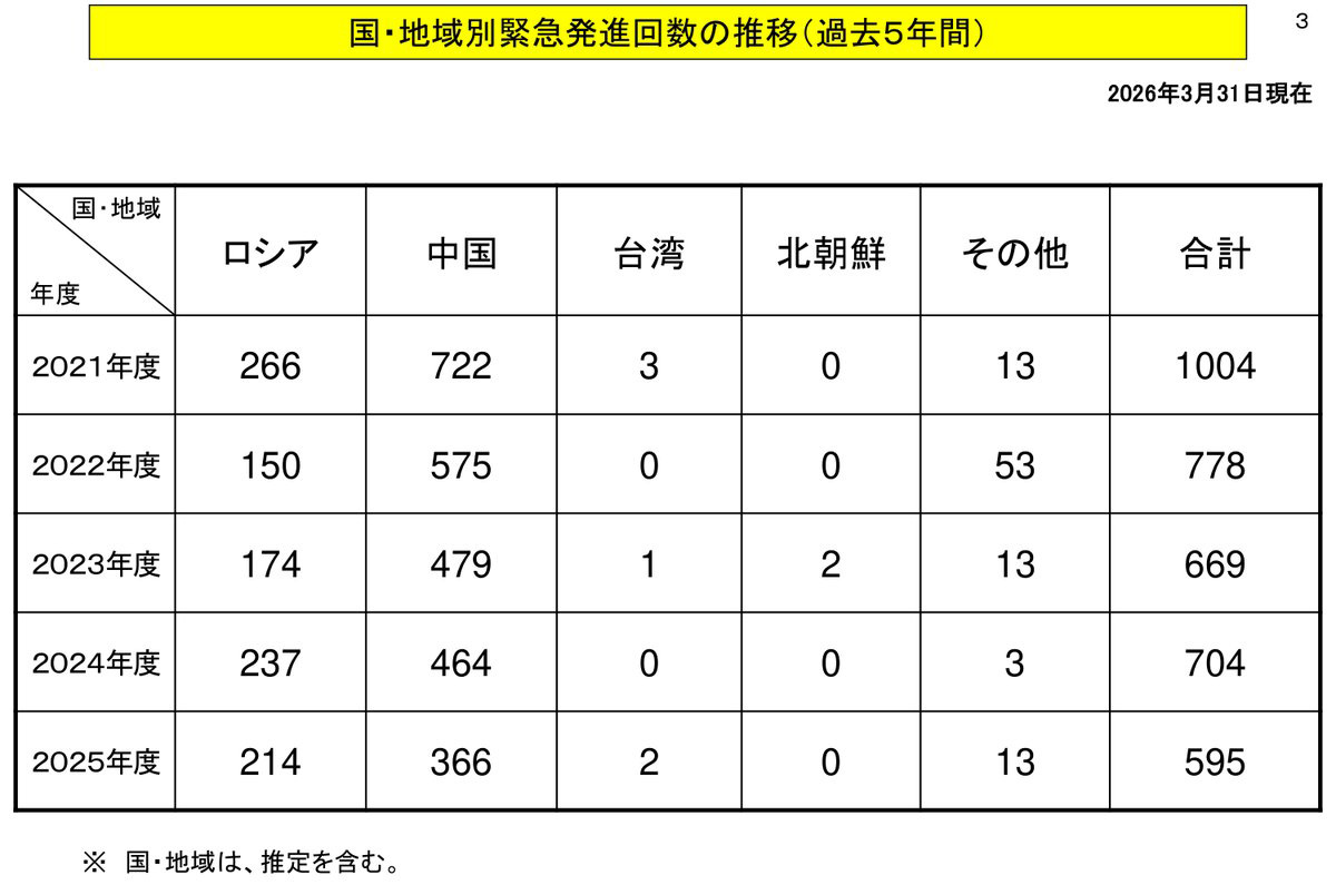防衛省 統合幕僚監部は令和8(2026)年4月17日(金)14時30分、2025年度(令和7年度)の緊急発進実施状況について発表した。