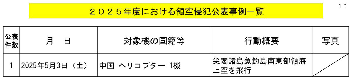 5月、尖閣諸島周辺の我が国領海に侵入した中国海警船から発艦したヘリコプターによる領空侵犯が発生。