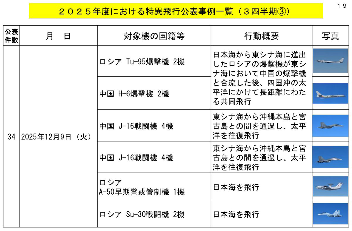 12月、中国空母が初めて、沖縄本島東方から奄美大島東方の太平洋上にかけて活動し、この際、空母から発艦したJ-15戦闘機が、当該機体に対して対領空侵犯措置を実施していた航空自衛隊のF-15戦闘機に対して、レーダー照射を断続的に行う事案が発生。同月、中国軍とロシア軍の爆撃機が、東シナ海から沖縄本島と宮古島の間を通過して、太平洋を四国沖まで長距離にわたり共同飛行したことを確認。