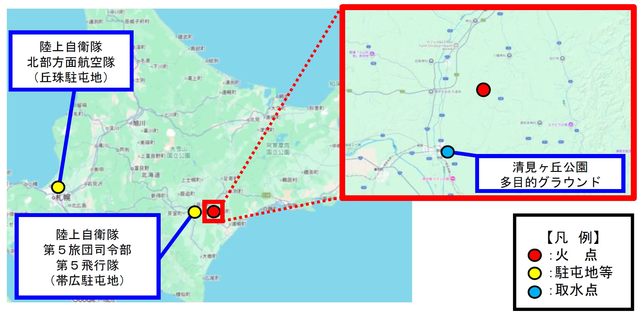 ○ 同日1821以降、陸上自衛隊第5飛行隊(帯広・北海道)、北部方面航空隊(丘珠・北海道)が、空中消火等を実施。