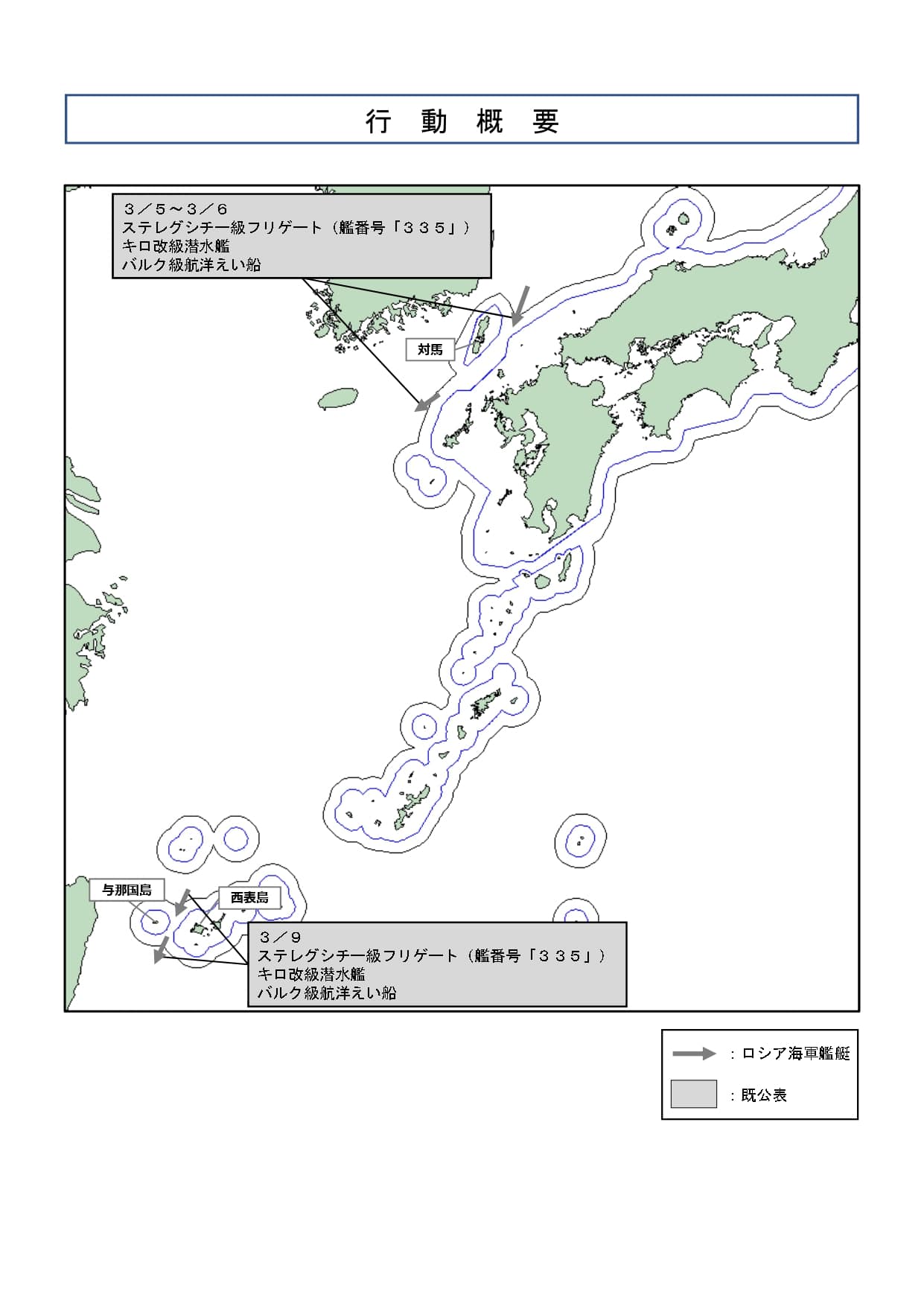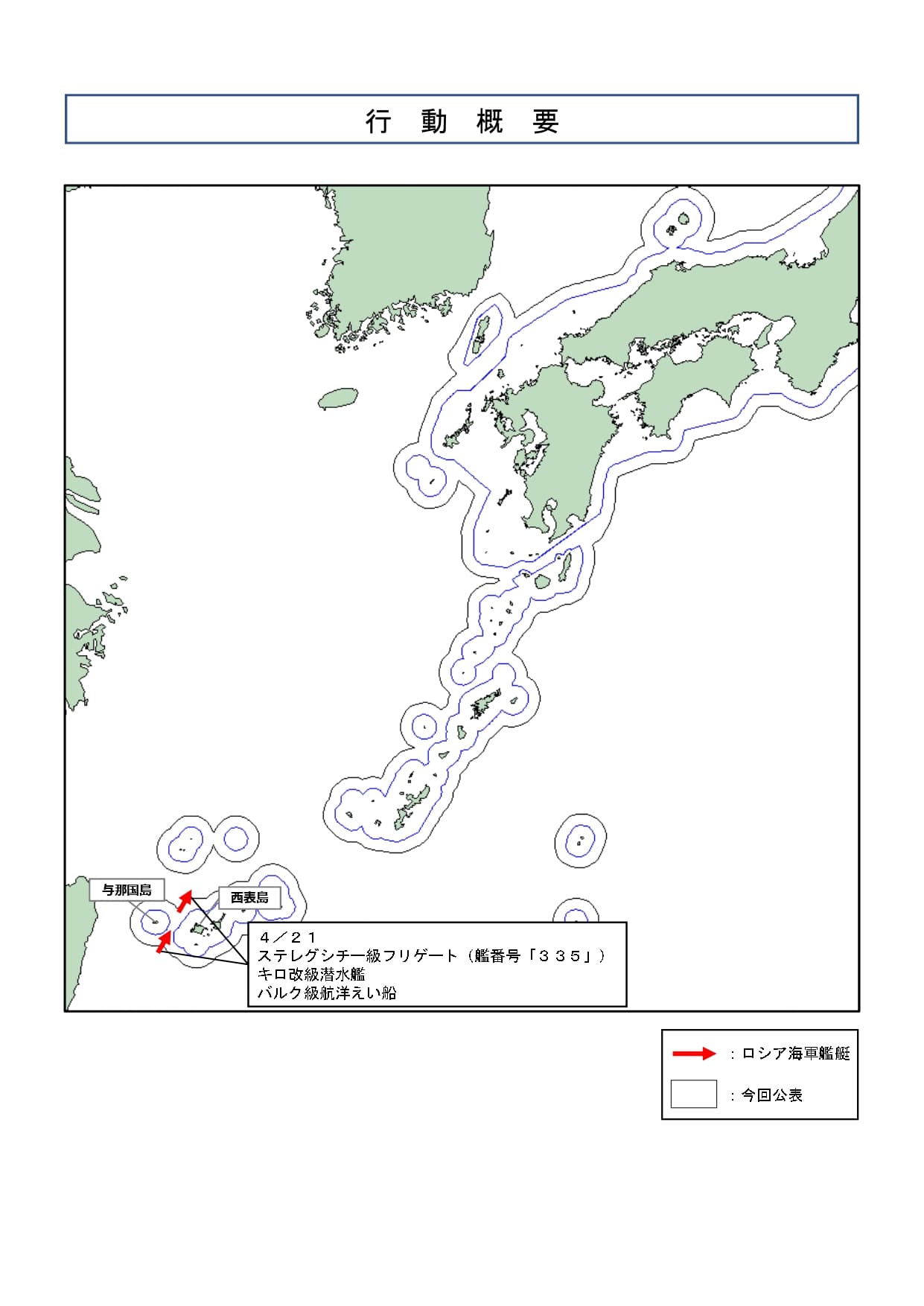令和8年4月21日(火)正午頃、海上自衛隊は、与那国島(沖縄県)の南約50kmの海域において、同海域を北東進するロシア海軍ステレグシチー級フリゲート(艦番号「335」)、キロ改級潜水艦及びバルク級航洋えい船の計3隻を確認した。