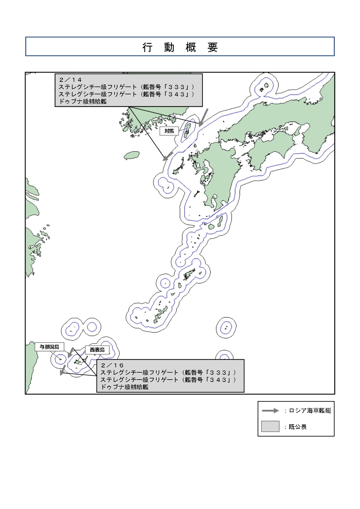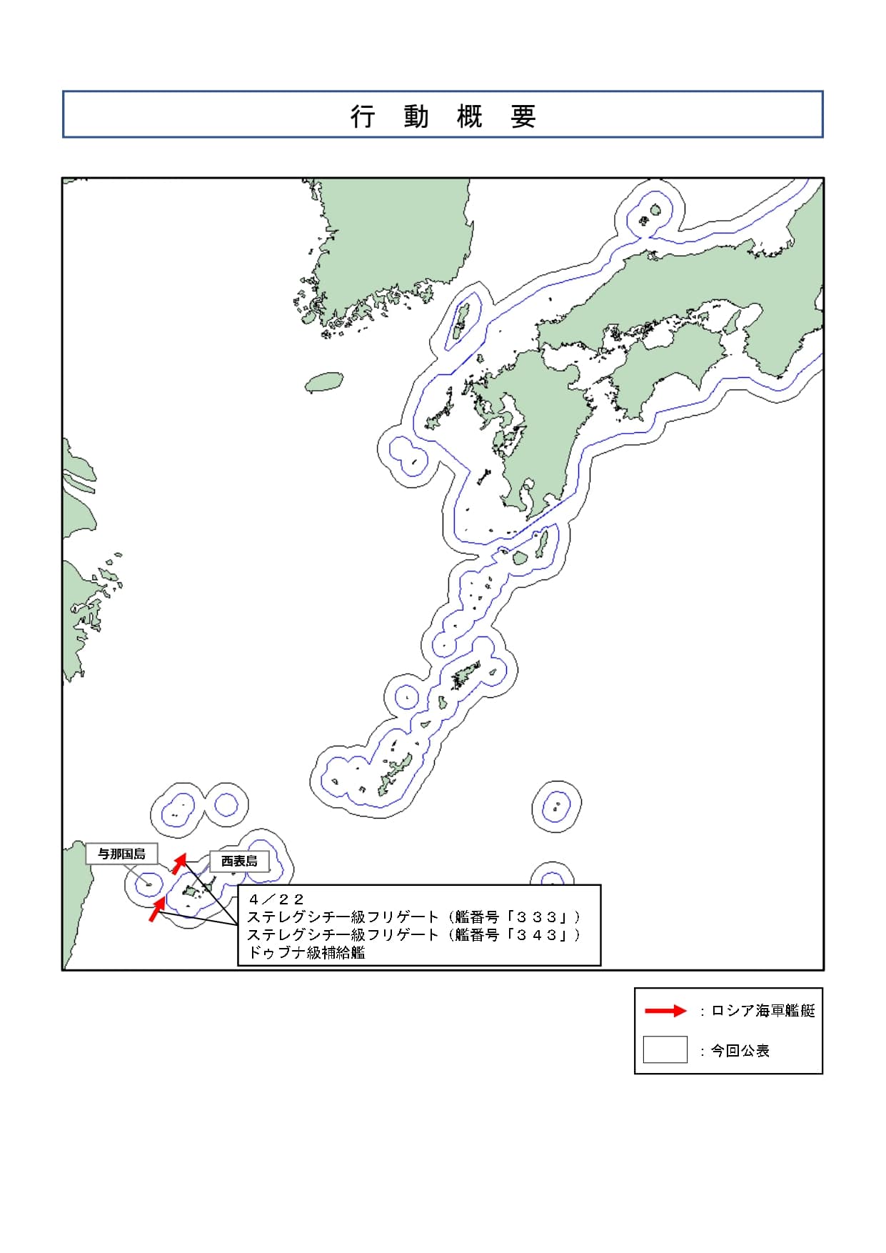 令和8年4月22日(水)午前0時頃、海上自衛隊は、与那国島(沖縄県)の南約70kmの海域において、同海域を北東進するロシア海軍ステレグシチー級フリゲート2隻(艦番号「333」及び「343」)及びドゥブナ級補給艦の計3隻を確認した。
