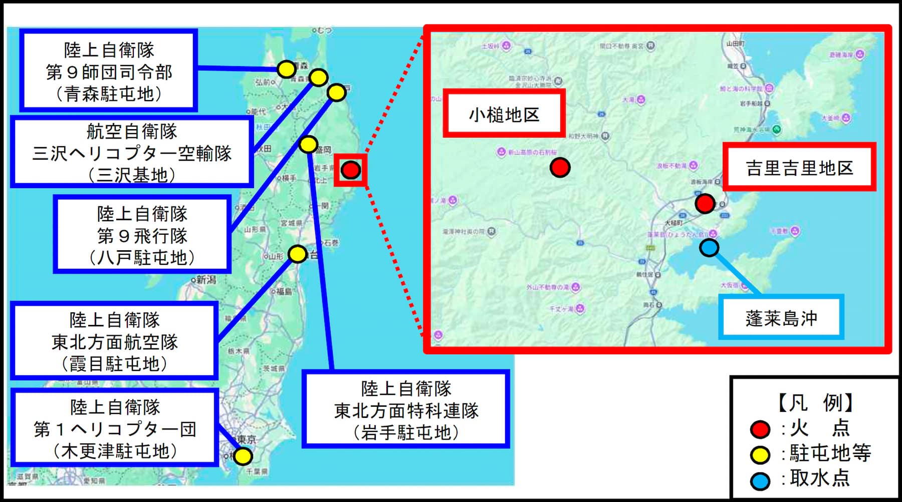 ○ 令和8年4月22日(水)、岩手県上閉伊郡大槌町において林野火災が発生。地元消防等が消火活動を実施 するも鎮火に至らないことから、同日1600、岩手県知事から陸上自衛隊東北方面特科連隊長(岩手・岩手県)に対し、空中消火に係る災害派遣要請があり同時刻受理。翌23日(木)0439以降空中消火等を開始