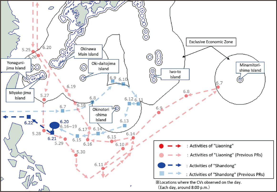 From May to June 2025, the Chinese Navy deployed a fleet led by the aircraft carriers Liaoning and Shandong to the Pacific Ocean, conducting unprecedented combat training exercises. This marked the first time that two Chinese aircraft carriers were deployed simultaneously in the Pacific for repeated aircraft takeoff and landing exercises. The Liaoning was deployed off the coast of Minamitorishima (Japan's easternmost point), located east of the “Second Island Chain” that connects the Ogasawara Islands to Guam, while the Shandong was deployed off the coast of Okinotori Island (Japan's southernmost point), located exactly midway between the “Second Island Chain” and the “First Island Chain” that connects the Southwest Islands to Taiwan. From there, the Liaoning rapidly altered course southwest, narrowing the distance between the two fleets as the training progressed.