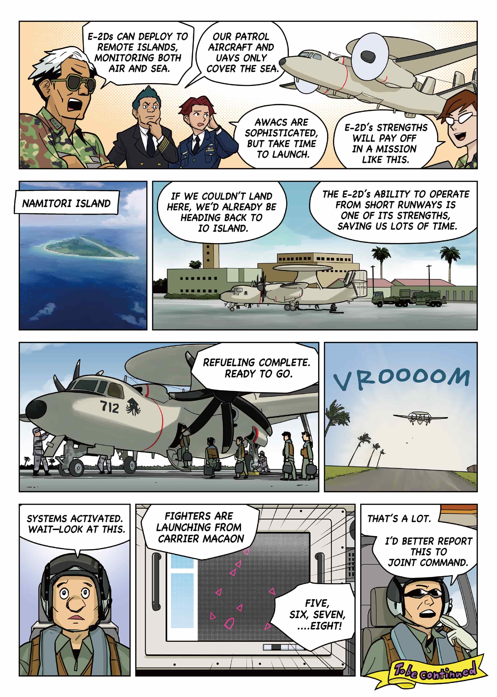 The E-2D, on the other hand, solves all of these problems. Although slower than the E-767, its takeoff and landing distances are very short due to its origins as a carrier-based aircraft, making operation from small airfields on remote islands, including Minami-Torishima, problem-free. Refueling and personnel changes can be carried out on remote Pacific islands without returning to the mainland, a major advantage when conducting continuous surveillance.