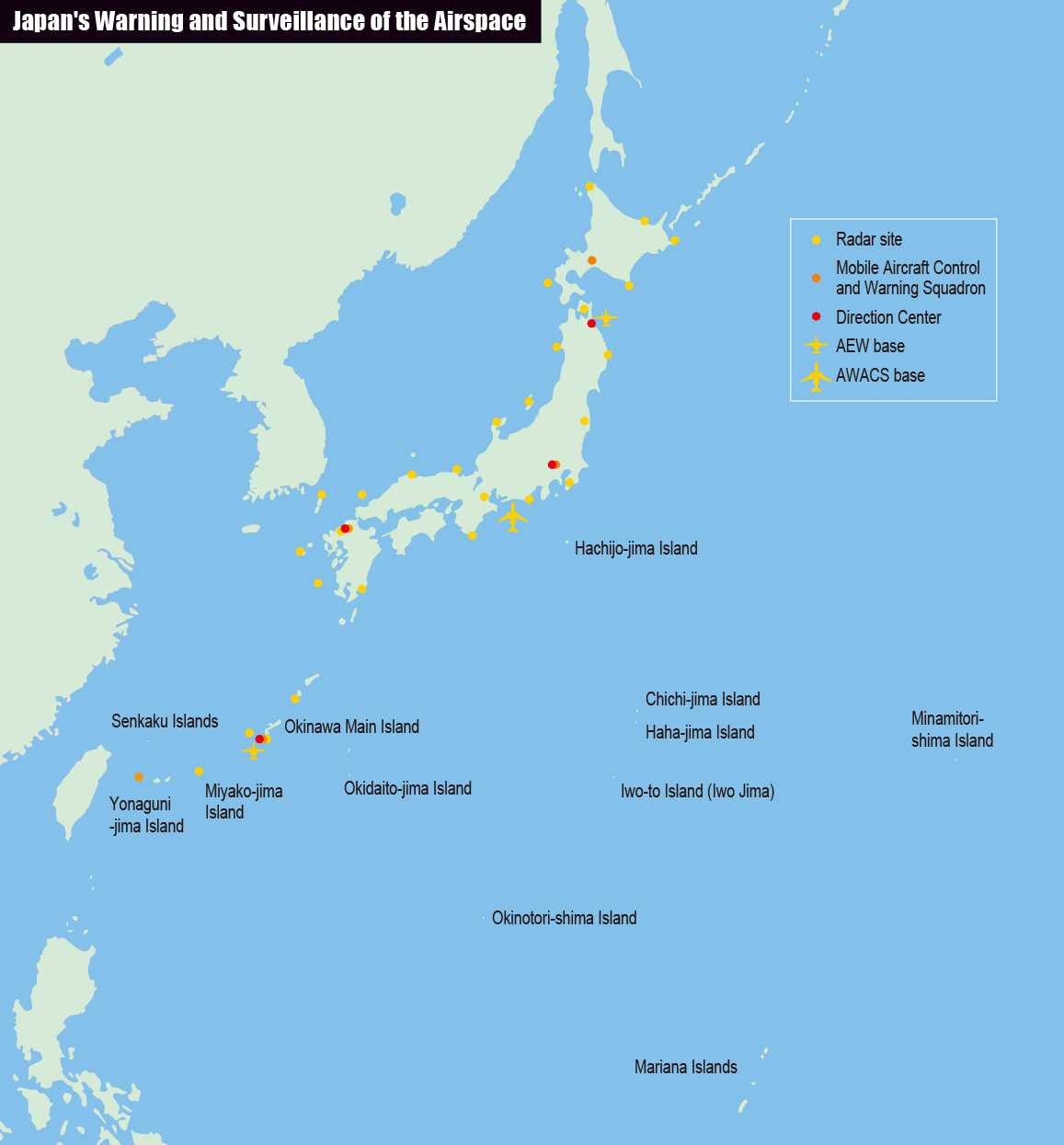 A map showing the locations of Japan's air surveillance radars (28 radar sites), mobile aircraft control and warning squadron (4 sqs), Direction Centers (4 locations), and AEW and AWACS(E-2C/E-2D, E-767). Radar sites and Direction Centers are located in the Japanese archipelago and the southwestern islands, but the Pacific Ocean is empty.