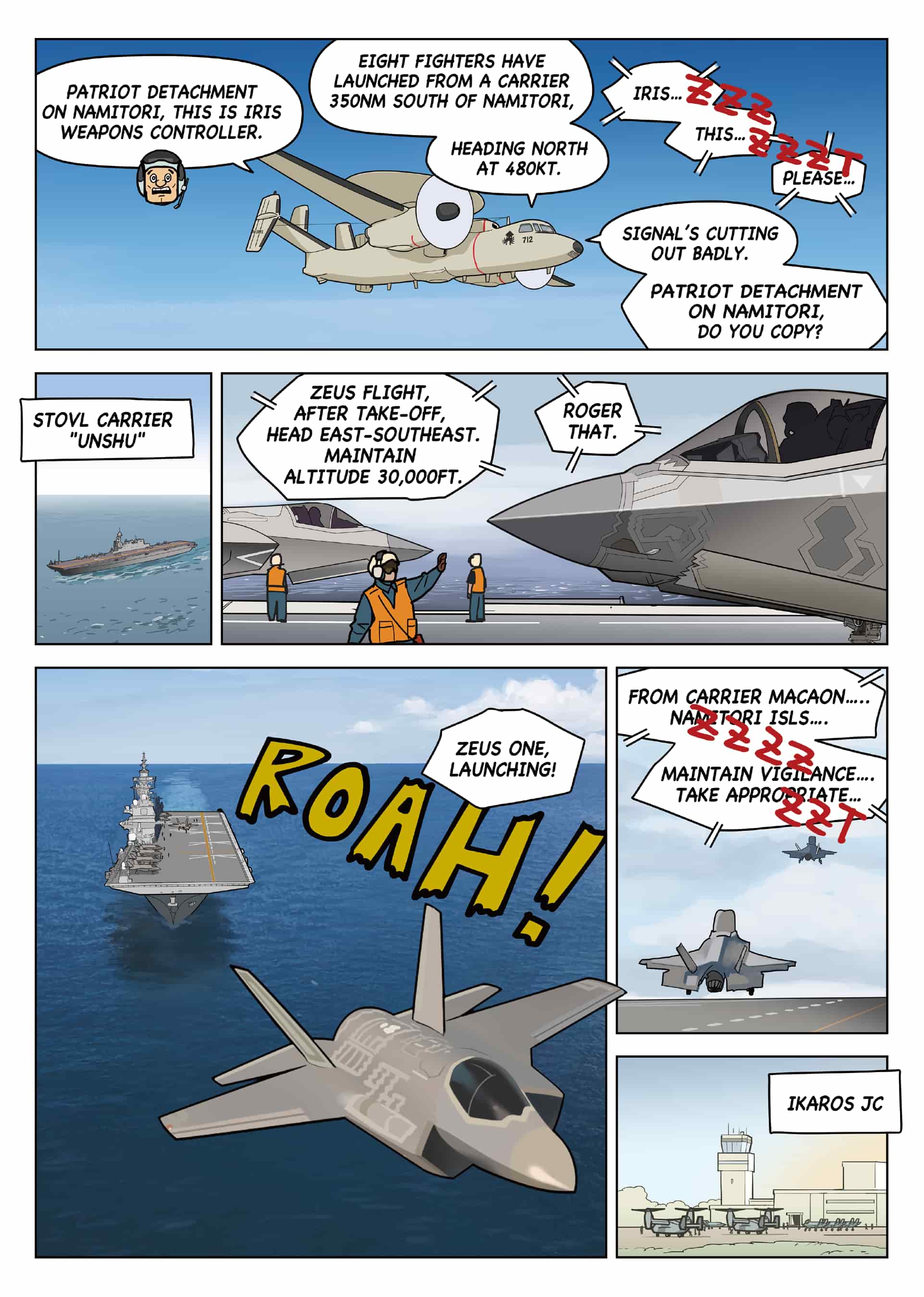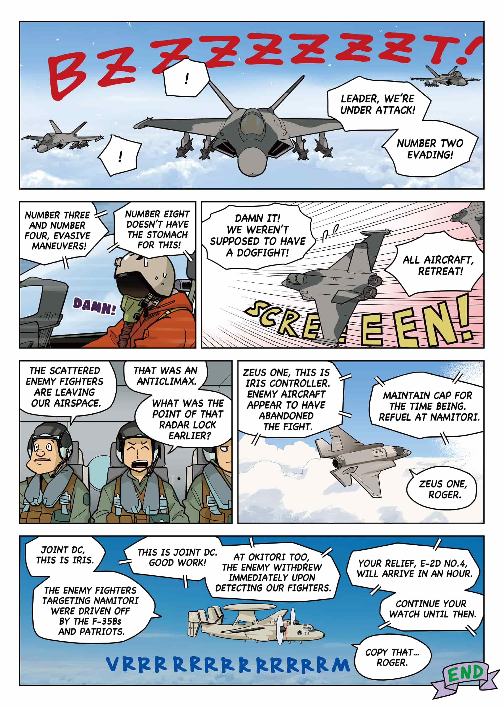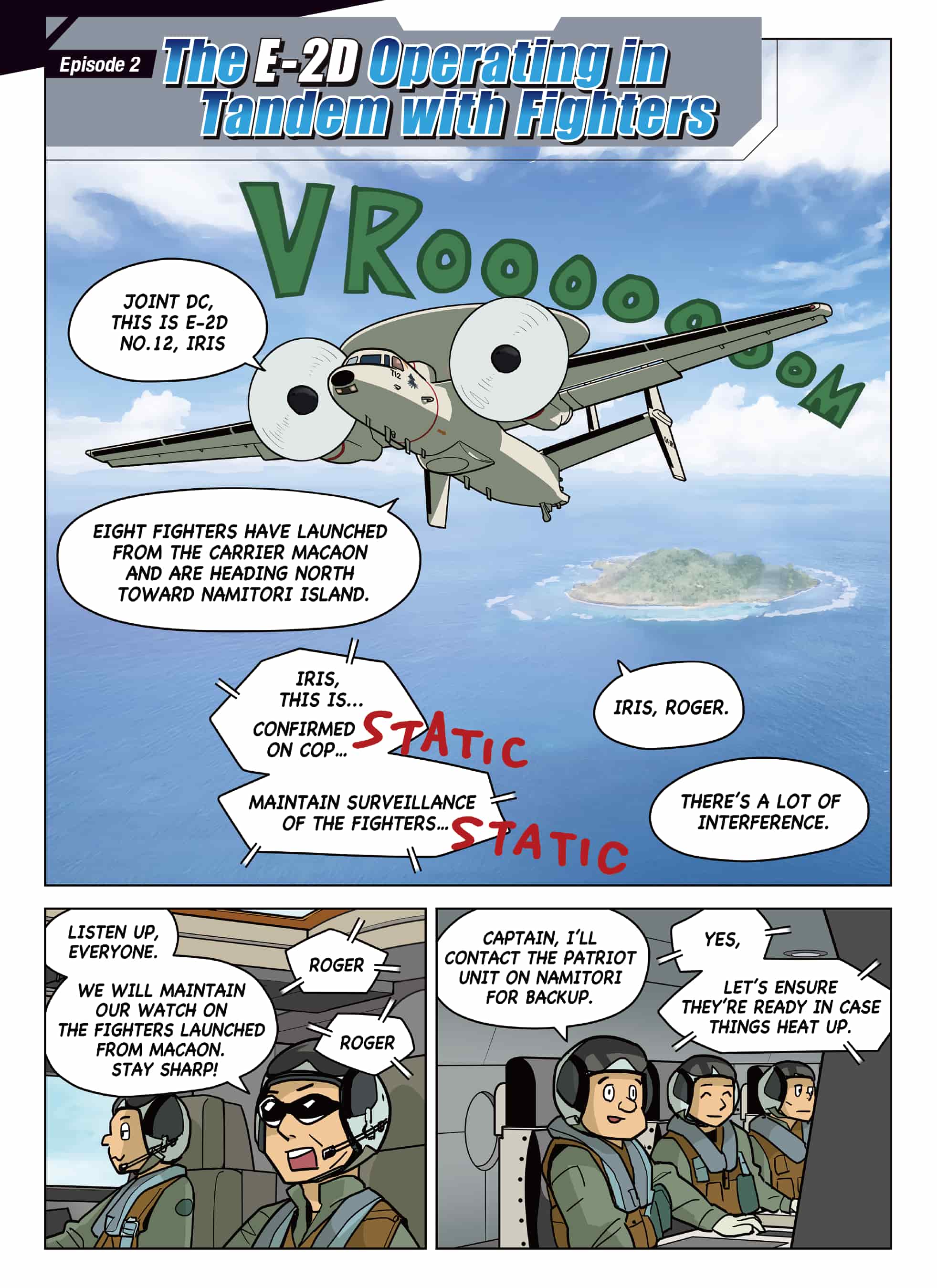 In the manga, an E-2D controllers command and control the F-35Bs and Patriot SAM units, successfully driving away the hostile fighter jets attacking the island. However, while the aircraft is “AEW & C” (Airborne Warning and Control), the Air Self-Defense Force only uses the E-2D's “AEW” (Airborne Early Warning) capabilities. Will the “C” (Control) continue to be unused? ──Koji INOUE