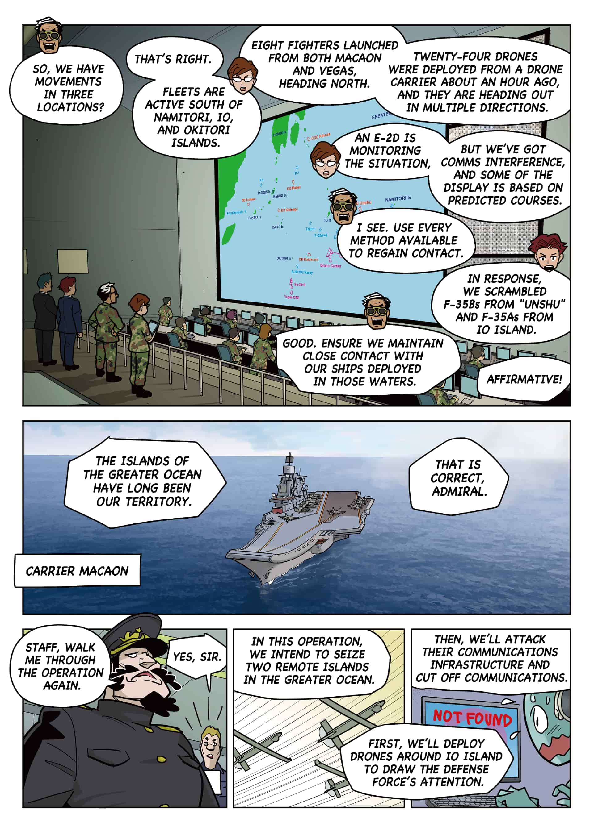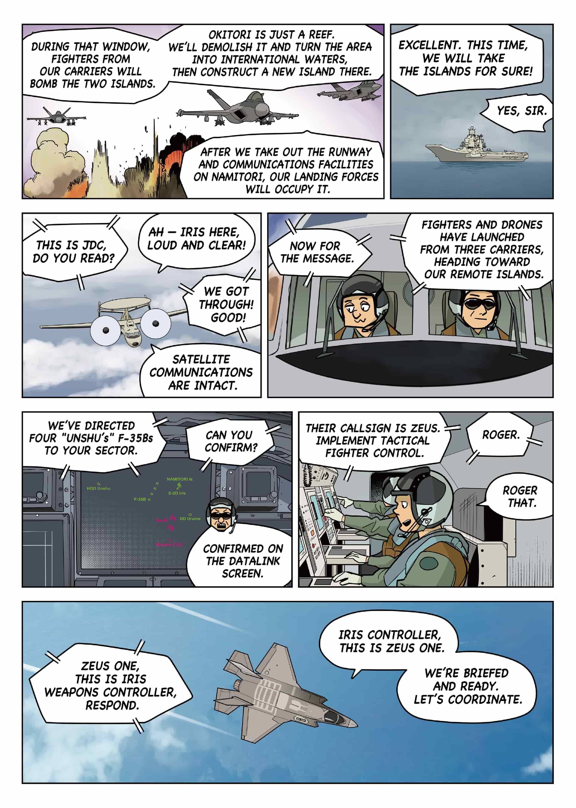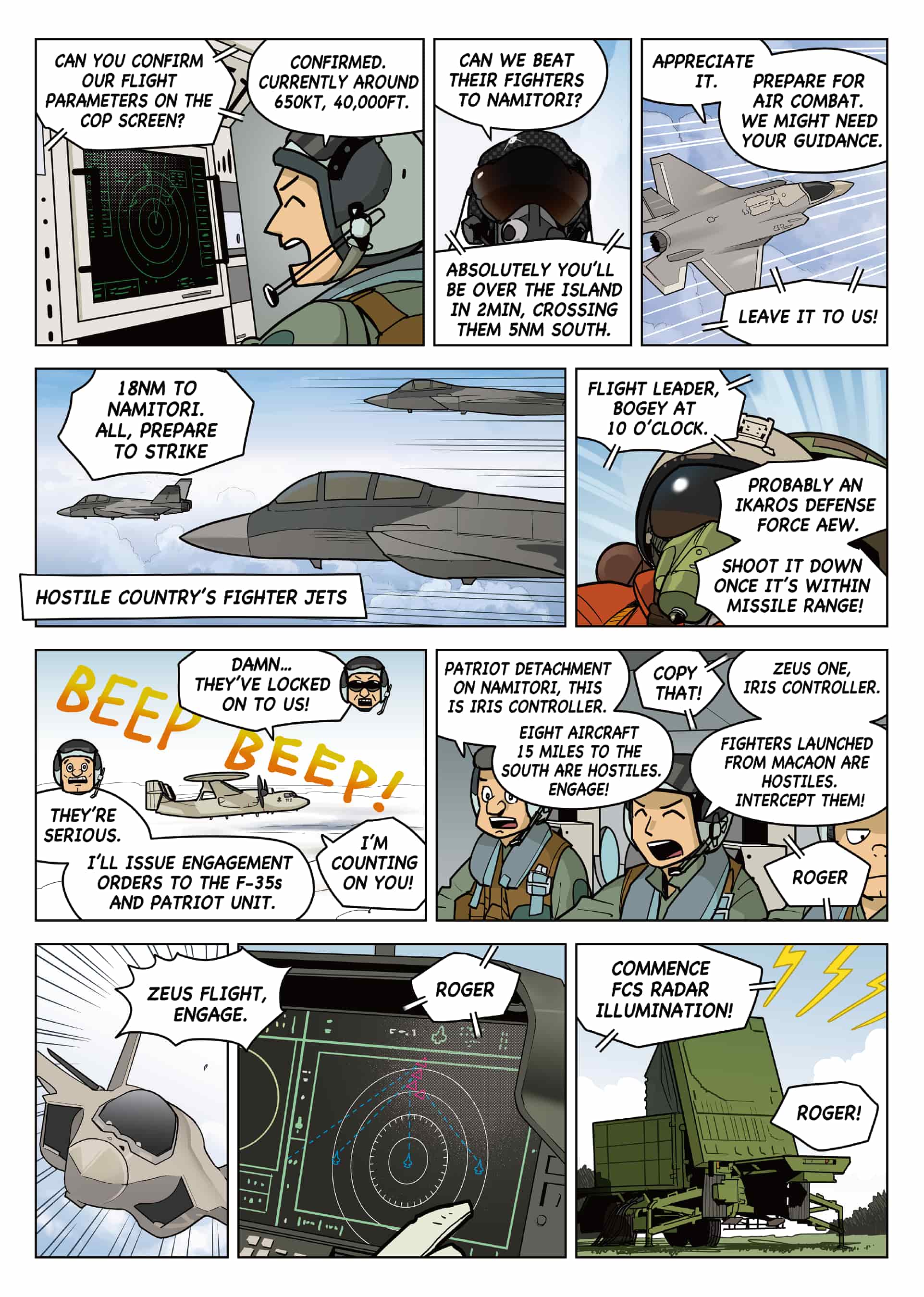 In the manga, an E-2D controllers command and control the F-35Bs and Patriot SAM units, successfully driving away the hostile fighter jets attacking the island. However, while the aircraft is “AEW & C” (Airborne Warning and Control), the Air Self-Defense Force only uses the E-2D's “AEW” (Airborne Early Warning) capabilities. Will the “C” (Control) continue to be unused? ──Koji INOUE