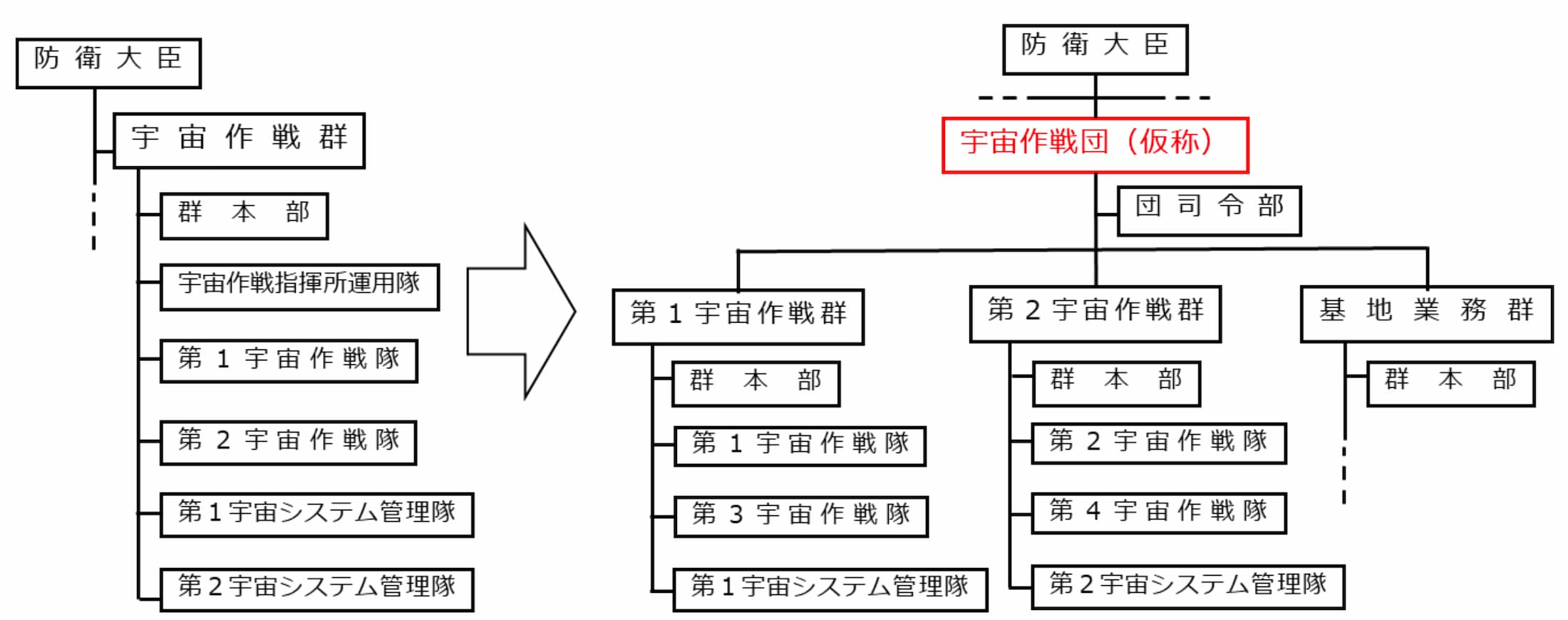 これまで単独の群編成だった宇宙部隊は、今回の改編により石井浩之(いしい・ひろゆき)空将補を司令とする団司令部の隷下に複数の群を置く組織へと移行した。第1、第2宇宙作戦群の下にはそれぞれ2個宇宙作戦隊と1個宇宙システム管理隊が配置され、SDA(宇宙領域把握)任務や新規装備の運用を担う体制となっている。これにより、従来約310名規模だった部隊は、約670名規模へと倍増した。これは、令和8(2026)年度末に予定されている「宇宙作戦集団」への発展、および航空自衛隊の「航空宇宙自衛隊」への改称を見据えた段階的措置でもある。