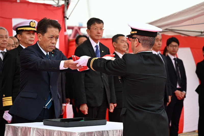 音響測定艦「びんご」の引渡式・自衛艦旗授与式を三菱重工マリタイムシステムズで実施(3月6日)